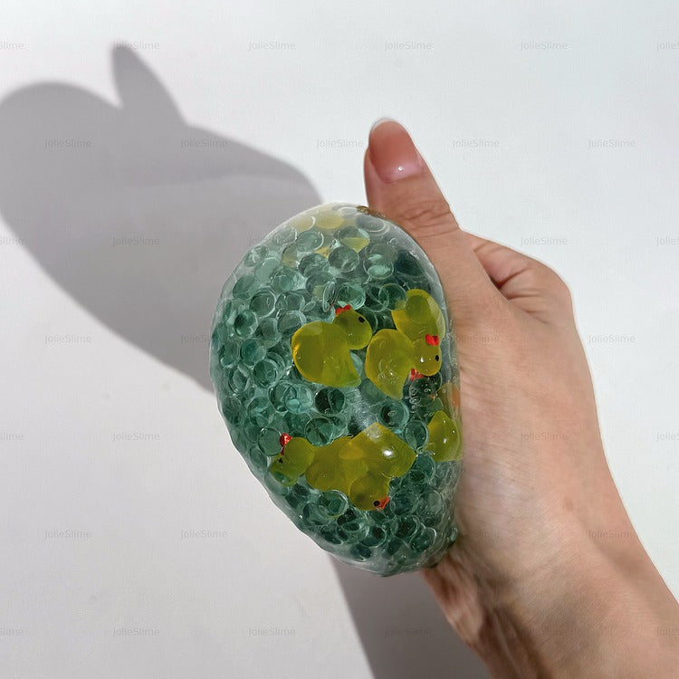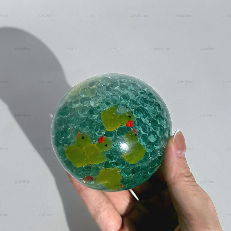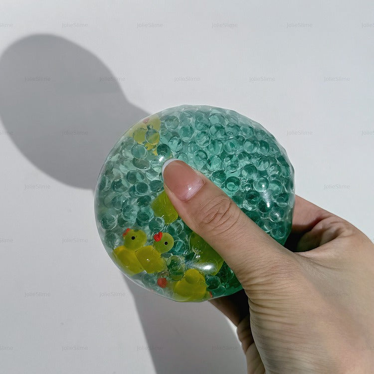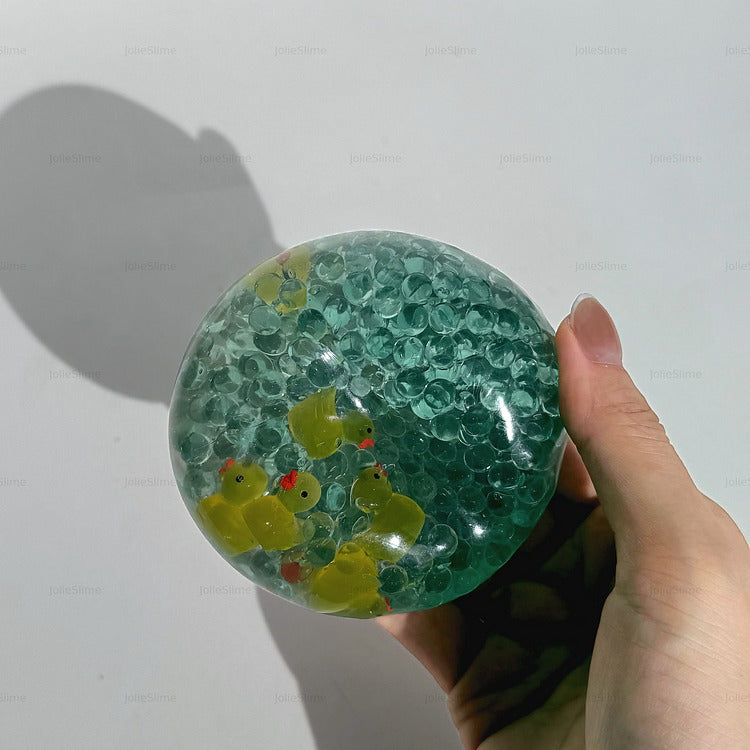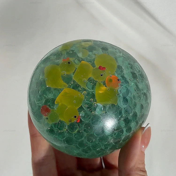Chilly Waddle is a playful, gel-filled stress ball featuring bright yellow duck charms floating in a sea of crystal-clear gel and icy blue cubes. It’s like a mini frozen pond in your hand! The smooth, shapeable texture offers a refreshing squish, while the ducks bring instant joy and calm. Perfect for fidgeting, squeezing, or just admiring its frosty charm.