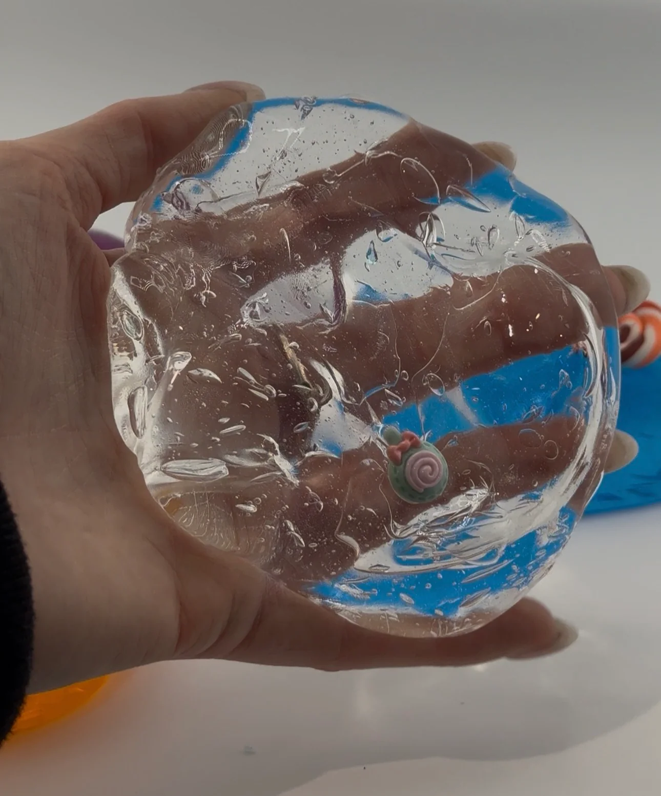Colorful crystal-clear sugar jelly slime with a glossy stretch and surprise candy charms inside.
